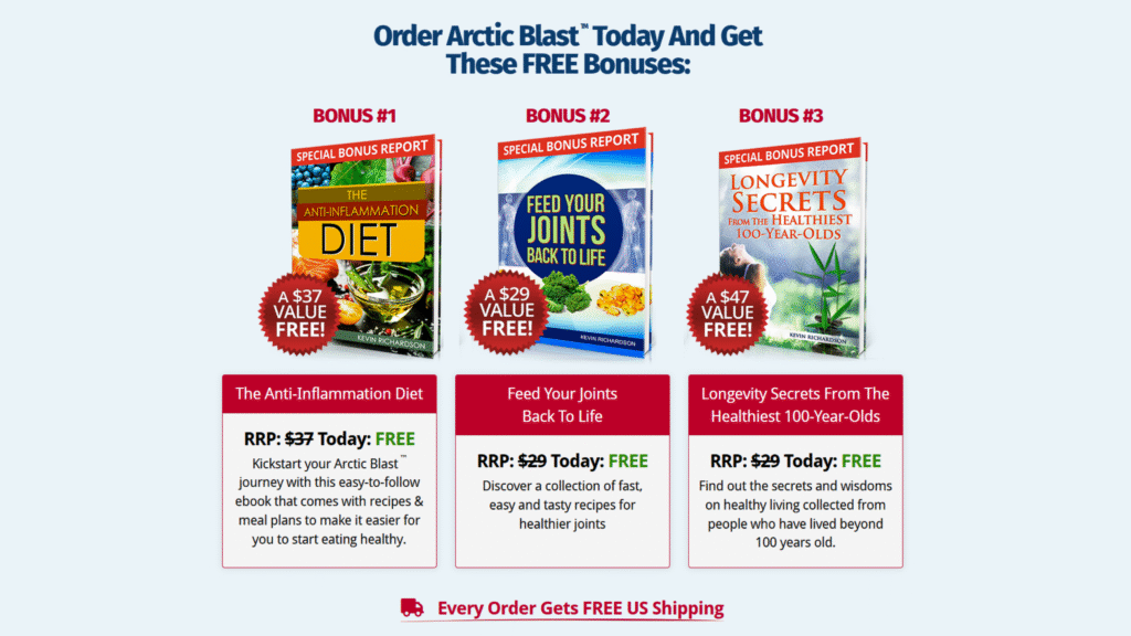The third bonus, Longevity Secrets From the Healthiest 100-Year-Olds, shares tips on maintaining active and healthy lifestyles, giving users additional insights into holistic wellness. Combined with the Topical solution for aches and discomfort, these bonuses make Arctic Blast a complete pain management and wellness system.