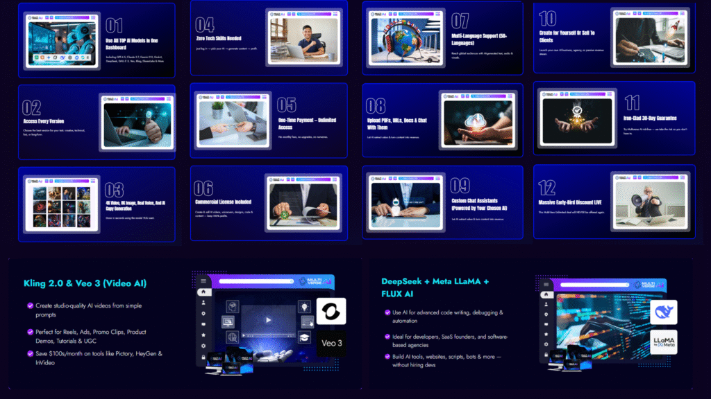 Multiverse AI works by consolidating multiple AI engines into a single, cloud-based dashboard. In this Multiverse AI Review, it’s clear that the system eliminates the need for juggling multiple subscriptions, tools, and platforms. Users gain access to GPT models, Claude, Gemini, Grok, DALL·E, Stable Diffusion, ElevenLabs, Kling, Veo, LLaMA, DeepSeek, and FLUX AI — all in current and future versions. The Multiverse AI Features include Turbo Mode for speed, Auto-AI Selection for optimized outputs, one-click export for instant downloads, DFY prompt libraries, and ready-made templates.